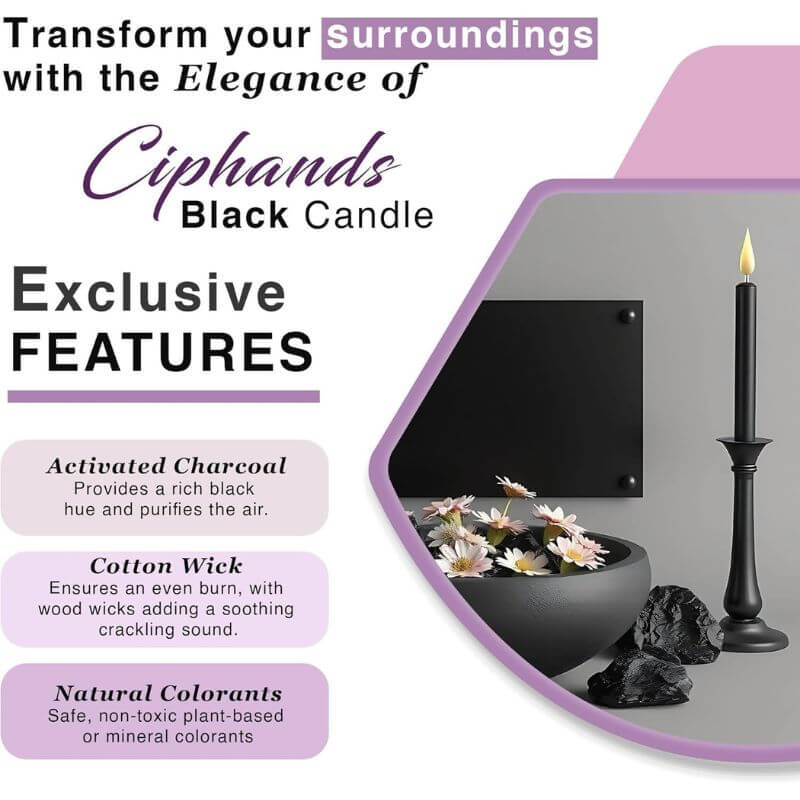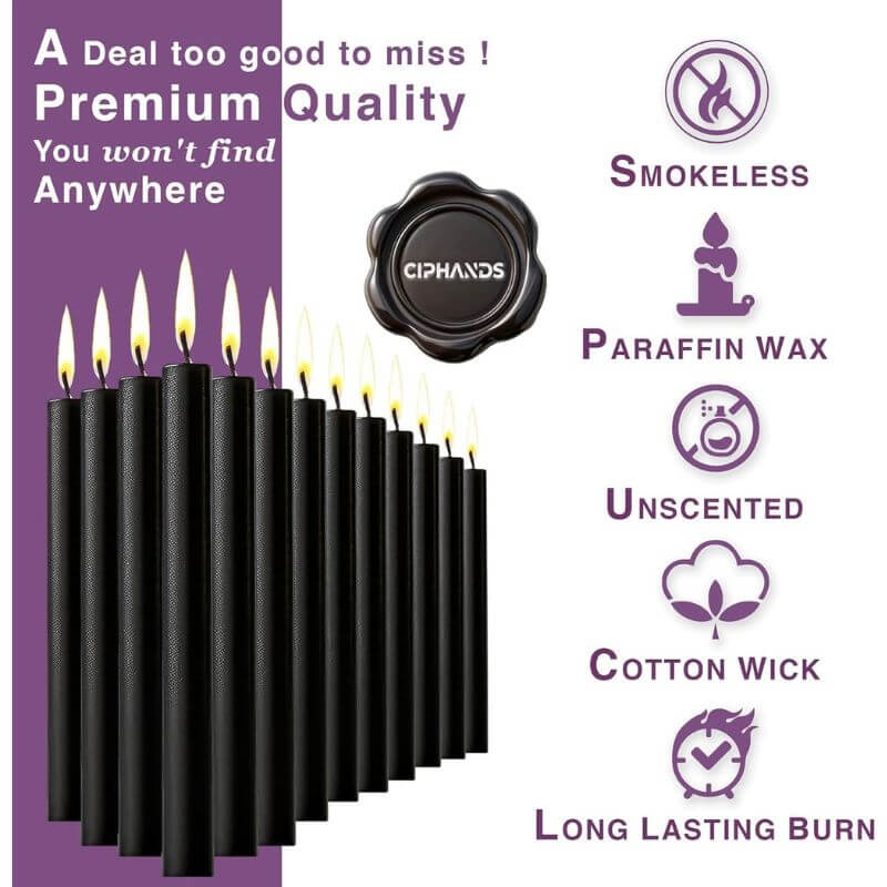 Bring powerful energy, elegance, and purpose into your rituals with this 40 pcs set of Black Chime Candles. Each mini taper candle measures 4 inches tall and 0.5 inches wide, making them a perfect fit for most candle holders. Crafted from natural paraffin wax with pure cotton wicks, these unscented dripless candles burn cleanly, creating a long-lasting, steady flame without smoke or unpleasant odor.