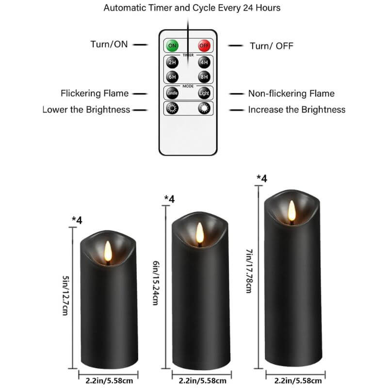 This set includes 12 battery-operated LED pillar candles in three heights (5”, 6”, and 7”) with a diameter of 2.2”, making them a perfect fit for any tabletop, lantern, or centerpiece. Controlled by a remote with 2/4/6/8 hour timer settings, these candles can cycle daily, allowing you to enjoy worry-free candlelight that automatically turns on and off at your preferred time.