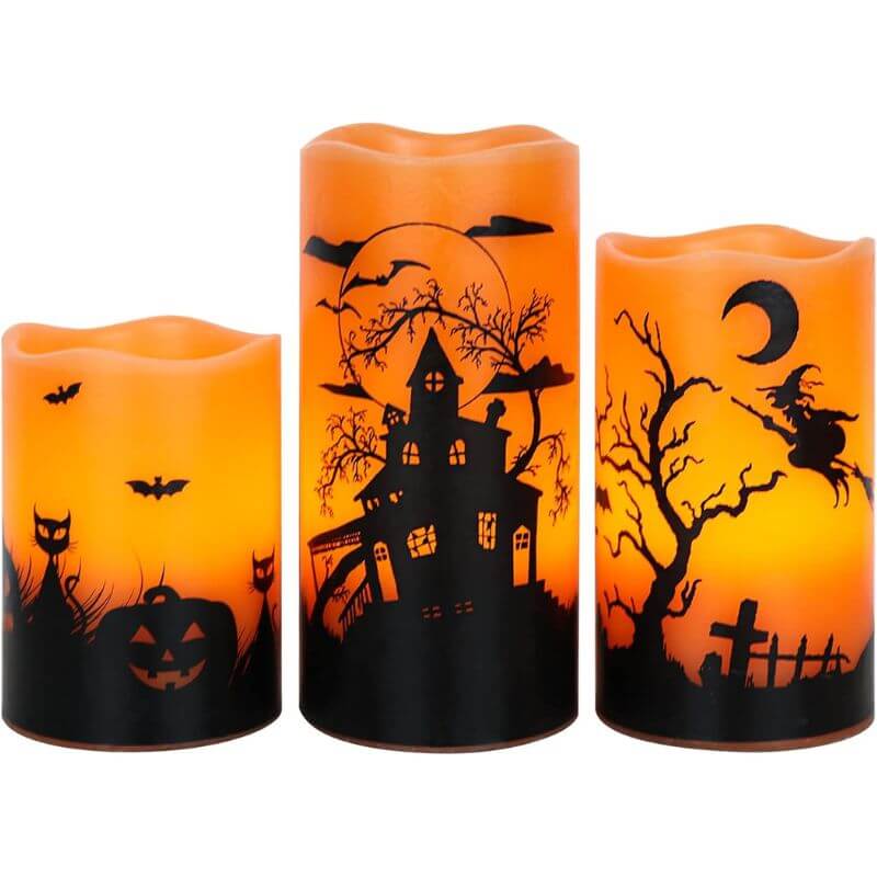 • Perfect Size for Décor – Set includes 3 candles (3″ diameter x 4″, 5″, and 6″ heights), ideal for table centerpieces, window sills, mantels, or haunted house setups.